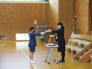 まずは、読書賞の表彰を行いました。今年一年間で、決められた冊数の本を読めた人は、読書賞の賞状をもらうことができます。代表の5年生は、一年間に300冊以上読破したそうです。素晴らしいことですね。