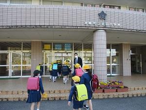 今日から1年生もお兄さん,お姉さんたちと一緒に集団登校しました。下級生たちのことに気を配りながら,ゆっくり歩く素敵な姿が見られました。