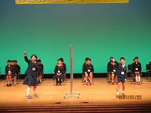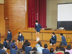 この後は、児童会タイムです。企画委員会が中心となって、委員会からのお知らせや発表をしてくれました。今日は環境委員会からプルタブ・ペットボタルキャップ集めのお願いと体育委員会から縄跳びの技紹介がありました。