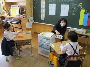算数科では、文章題が何算になるのか、その根拠となる言葉や意味をじっくりと学習していました。国語科では、2に別々のメニューとなるためしっかりと分かれて、自分の学習に集中できるよう工夫されていました。先生はその子にあった様々な教具を使用してくれています。2人とも作文がどんどん上達していてびっくりしました。