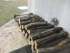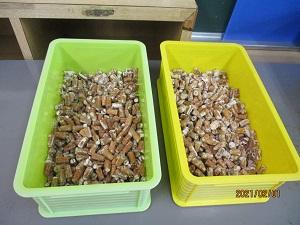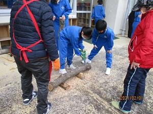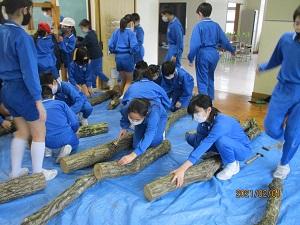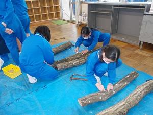 作業は2人1組で行います。まず、チョークで印をつけていきます。一列に4~5個互い違いにつけていきます。その後、ドリルで穴をあけます。そして金づちや木づちで菌を打っていきます。終わったら外に運びます。たくさん木があったので、1人2~3本作ることができました。この後春になったら、あまり日の当たらないところへ運び、じっと待つのみです。たくさんのしいたけを食べることができるといいですね。