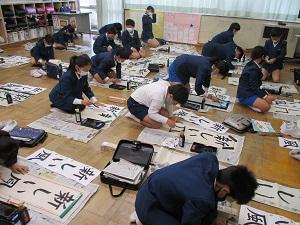 習字紙でポイントを練習しているクラスやいよいよ書初め用の紙に何枚か書いているクラスもありましたが、みんな真剣に取り組んでいました。