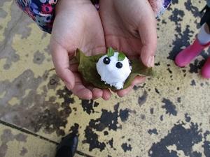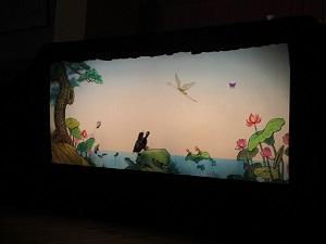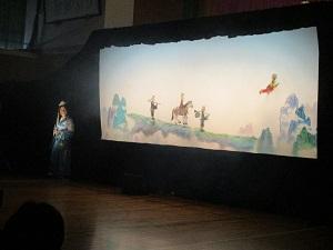 始めに、「鶴と亀」という影絵劇を観ました。このお話に出てくる魚・蝶・蛙・小亀の人形を作った子どもたちが裏方で参加しました。とっても上手に動かすことができましたね。本当にきれいな影絵劇で、子どもたちの心にずっと残る体験ができたように思います。