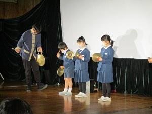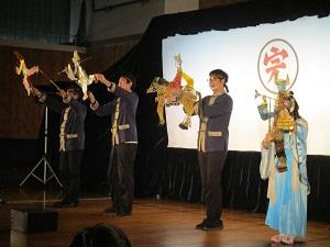こちらは、本格的な影絵劇で、セリフを言いながら人形を動かします。コミカルな動きで笑えるところや早業で次々と変身するところ、スモークや炎のようなライトの演出もあって、1年生も最後までとても集中してみていました。