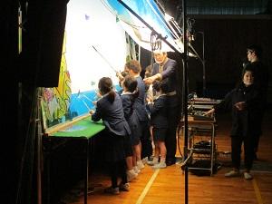 これに先立ち11月10日には、3・6年生が影絵人形を作るワークショップを行いました。今日はその3・6年生から各10名が、実際に作った自分の人形で劇団の方々と共演するという参加型の芸術鑑賞会でした。