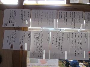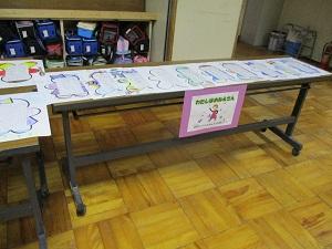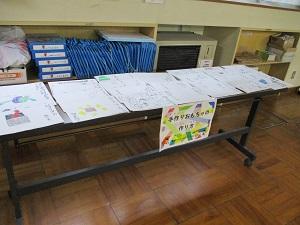 2年生。国語の時間に書いた作品がテーブルにたくさん並んでいました。