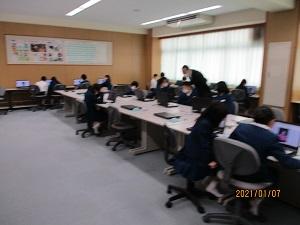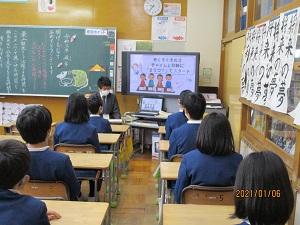 2限目は、体育館の寒さや新型コロナウィルス感染拡大を配慮して、教室で放送とプレゼンテーションソフトを使っての始業式でした。