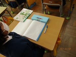 1年生。1月の学習目標、「4点セットでスタートしよう」がしっかりとできています。