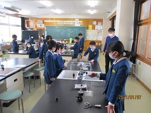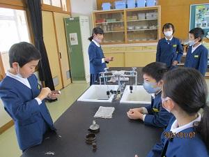 4年生。理科の実験で、1人1人がマッチを擦り、鉄球を温めて金属は温めるとどうなるのかの実験をしていました。