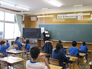 そんな中、文化庁「文化芸術による子供の育成事業」として、劇団「影法師」の皆さんによる影絵劇を鑑賞しました。3・4限目は1~3年生、5・6限目は4~6年生と2回にわけて実施しました。