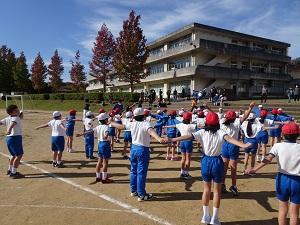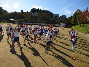 中学年も開会式の中で、代表の児童が、自分のめあてを発表しました。3年生は、代表児童が「がんばるぞ」と言い、みんなで「オー」という掛け声をかけました。4年生は、選手宣誓のスタイルで、「宣誓、我々4年生は最後まで走り抜くことを誓います」というような発表でした。どちらもとても元気いっぱい、気合いっぱいの発表でした。それから準備体操です。これも自分たちで進めていました。