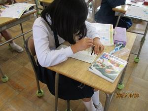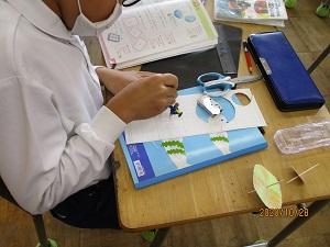 3年生は今、算数科でコンパスを使って学習をしています。今日は、少人数のクラスでコマの模様をコンパスを使って描いていました。