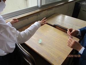 コンパスでの模様づくりは、中心がどこになるのかしっかりとイメージしなければ難しいですね。工作用紙の方眼を利用して描いていましたが、なかなか難しくて悪戦苦闘していました。だからこそなおさら出来上がったコマを使って遊ぶ姿はとても嬉しそうでした。