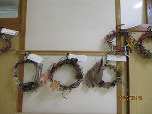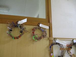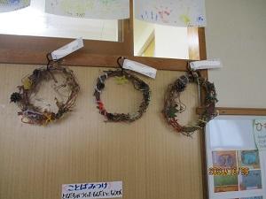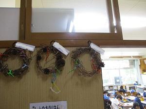 自分たちが育てたアサガオのつるでリースの土台を作り、校外学習で森林公園に行った時にひろった自然のものや毛糸などを使って飾りつけをしました。とっても素敵ですね。