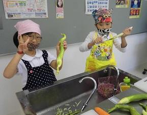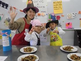 ハロウィンパーティーでは,6月から一生懸命育ててきた地元の食材「まこもだけ」を使って,まこものきんぴらを作りました。調理実習の目標は,協力して作ることでした。子どもたちは役割分担をし,自分にできることをしっかりとしていました。先生が何も言わなくても流し台のまこもの皮を拾っていて,とても素敵でした