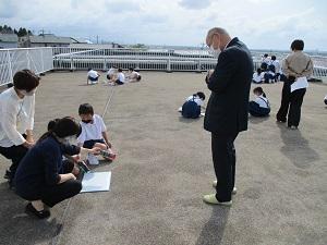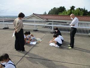 2年生の図工の授業では、屋上に出て、透明なプラスチックの容器などにマジックで書いた模様をお日様にかざして楽しむ「造形遊び」を参観しました。