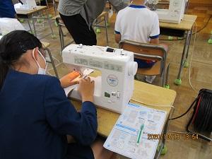 今年になって2回めのミシンを使っての作品づくりですが、平面のエプロンとは違って、袋という立体のものを作るのはレベルが高いです。しかも布は厚手のキルティング素材です。待ち針を打ったりしつけをかけたりするのも難しいのです。でもそこはさすが6年生。何とか左右の脇を縫うことができました。次はひも通しの部分です。最後まで頑張ってくださいね。