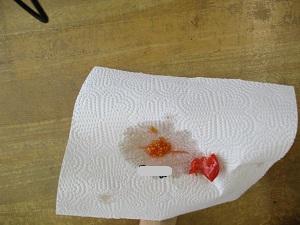 ではいよいよタネを取ります。まず、ミニトマトに穴をあけて、キッチンペーパーの上にその穴から中の実を絞り出します。