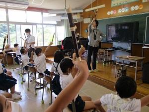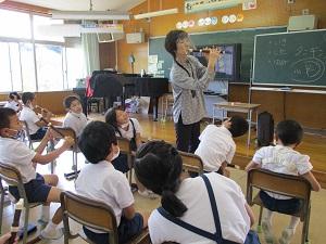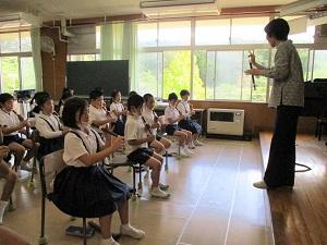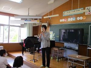 はじめに、リコーダーで「ちょうちょ」の変奏曲を吹いてくださいました。あまりのきれいな音色に、みんなびっくりしていました。それから、リコーダーに大切なこと、「いき(息)」「した(舌)」「ゆび(指)」の大切さについて、一つ一つ教えてくださいました。