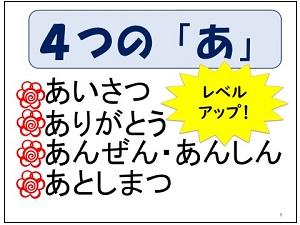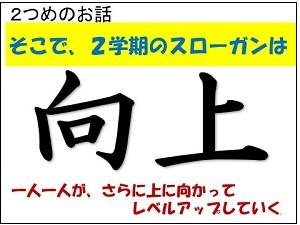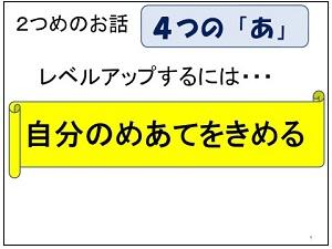 次に、2学期のスローガン、「向上」ということについて話をしました。2学期に1人1人がさらに伸びるためにしっかりと目標を決めてほしいこと、特に4つの「あ」については、全員にめあてを立ててほしいと伝えました。