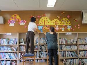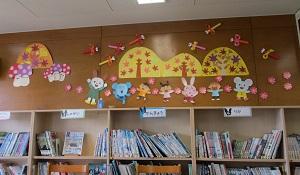 2学期から来てくださっている学校図書館司書の表さんとスクールサポートスタッフの押切さんのおかげで、とっても素敵な秋の掲示ができました。