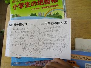 石川県の千枚田と庄内平野の田んぼの違いを読み取った後、今度は気温などのグラフを基に庄内平野の特色を見つけていました。資料を絞って与え、読み取っていくことはとても大切です。5年生の社会、難しいけど面白いのです。