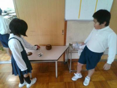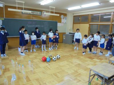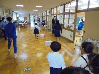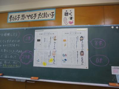 5年生の提案で始まった今月の「あいさつ運動」。朝のあいさつはもちろんのこと、長休みや昼休みのあいさつにも取り組んでいきます。あいさつができたら教室前にある碁石をビンに入れていきます。長休みは白の碁石を、昼休みには黒の碁石を入れていきます。