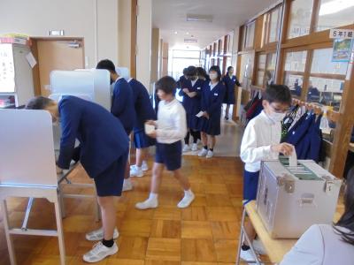 今日は町の選挙管理委員会のみなさんにお越しいただき、模擬投票体験の特別授業をしていただきました。実際に使用している投票箱や記載台などを使用し、投票の手順について教わりました。この後は津幡町のゆるキャラ4人を立候補者とし、実際に投票をしました。