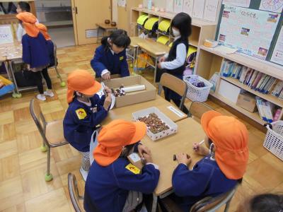 年長さんたちはそれぞれのコーナーを回って,楽しそうに遊んでいました。1年生たちもお兄さんお姉さんとして,呼びかけをしたりお世話をしたりする姿が見られました。