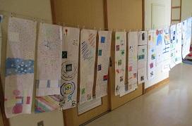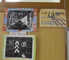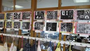 教室の前には、彫刻刀で彫った木版画のお弁当。図工室の前には、タイルのようなカードの模様を障子紙に思い思いに貼り、背景も工夫して描いた作品が飾られていました。個性的で、素敵な作品に仕上がっています。