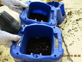 ③ポットのまま苗を鉢において、ポットと同じ高さまで土を入れる。(ぎゅっと押しながら詰めていく感じに)