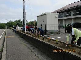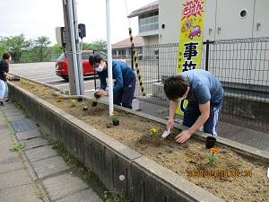 学校の校門から左右にのびた花壇に、オレンジと黄色のマリーゴールドの苗を植えました。