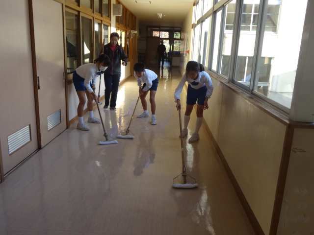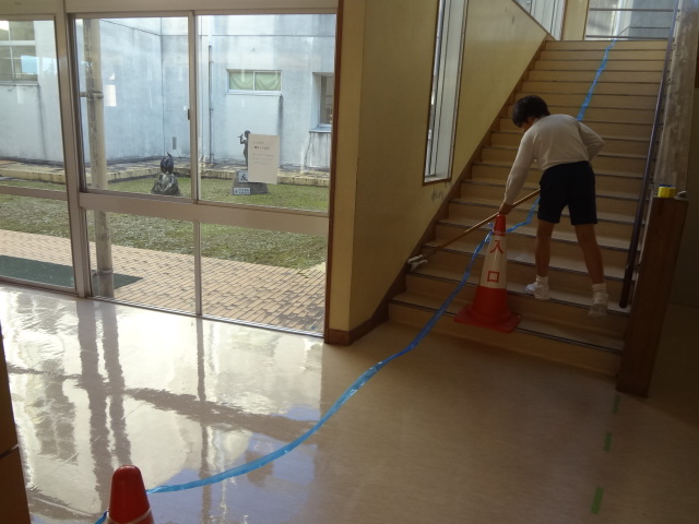 11月2日(金)6時間目に6年2組の児童と職員で校内の廊下と階段のワックスがけを行いました。