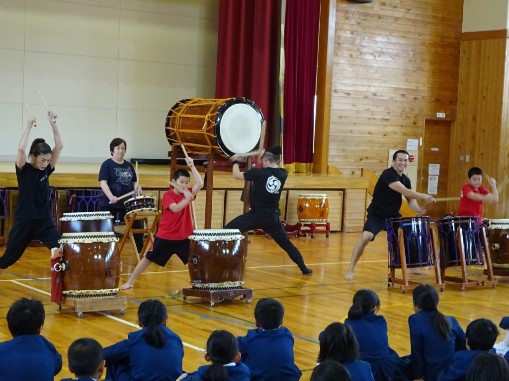 感想コーナーでは、「太鼓の音が身体にも心にも響いてきました。」「色々な音色の太鼓が聴けました。」「太鼓の演奏を聴いていると楽しい気分になりました。」という感想を発表していました。和太鼓演奏が児童の心にも身体にも響いたようでした。