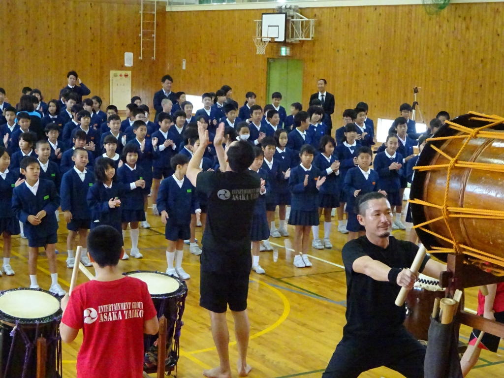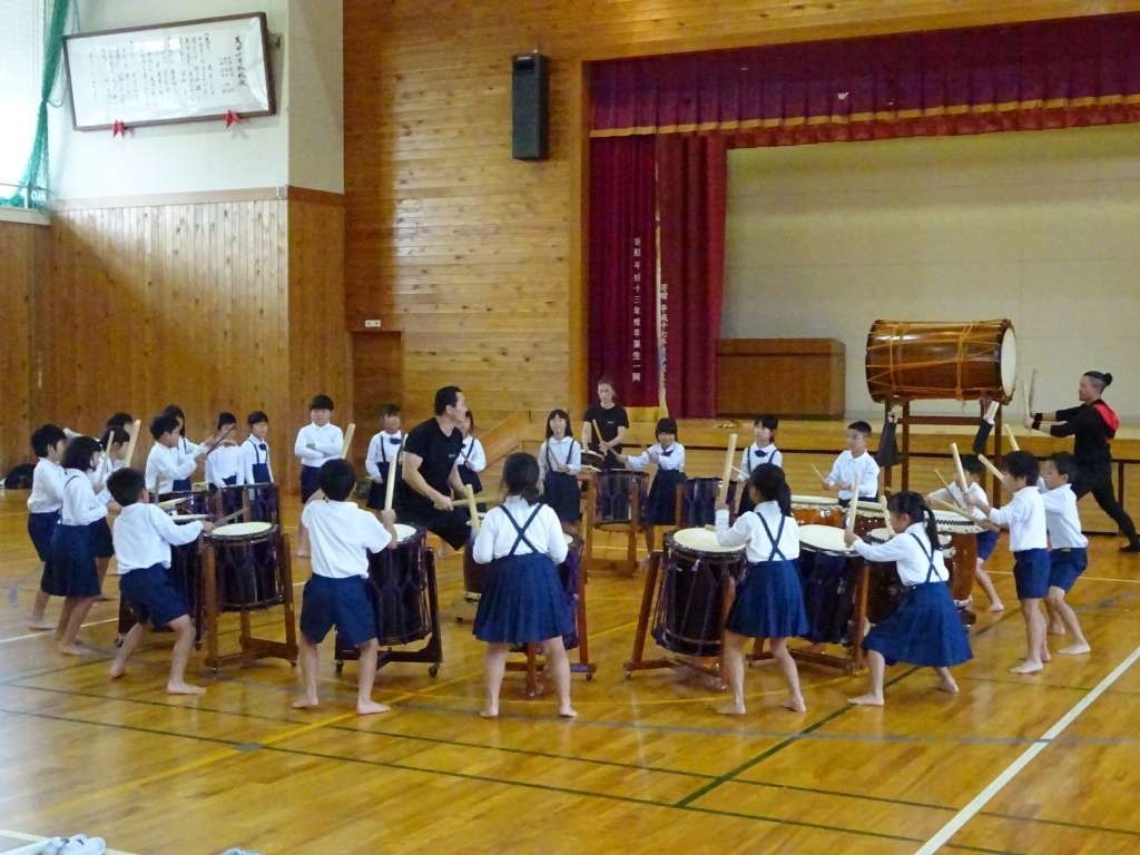 朝霞太鼓に所属する本校の児童も一緒に和太鼓の練習の成果を披露しました。