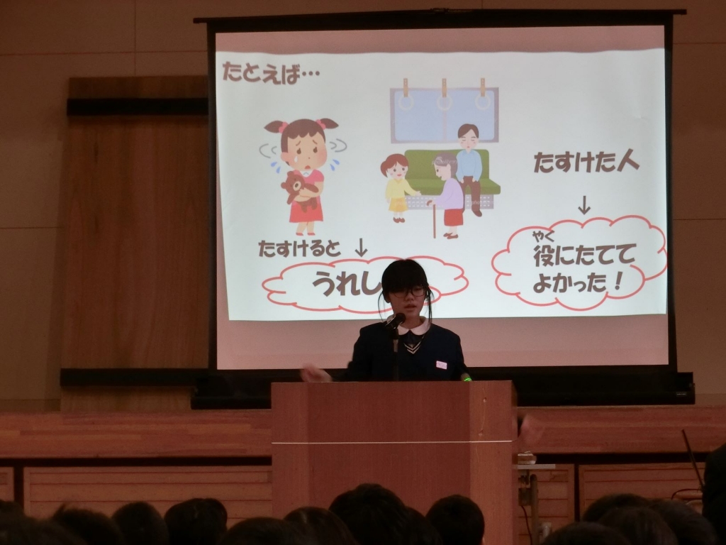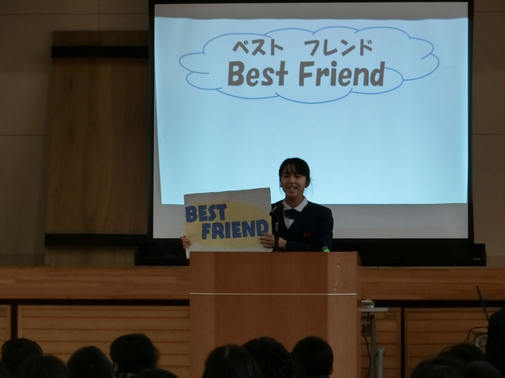 コンテストに出場する児童は、全校の前でジェスチャーも交えながら堂々とスピーチをしていました。今までたくさんの練習をしてきた成果がよく出ていました。