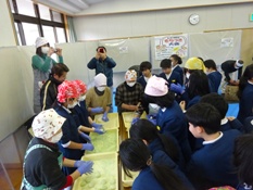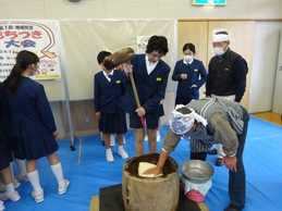 6年生が総合の時間に地域のお年寄りの方々と一緒にもちつきをしました。子どもたちは、お年寄りに教えてもらいながら楽しそうにもちをついていました。また、地域のお年寄りの方々とお話をしながら食べたつきたてのもちは特別においしい、と嬉しそうに話していました。子どもたちは、なかなかできない貴重な経験ができたと大変喜んでいました。