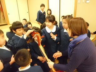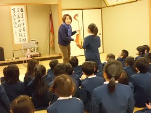 1年生が音読や歌を発表したり、教室で鉛筆の正しい持ち方を教えたりしました。