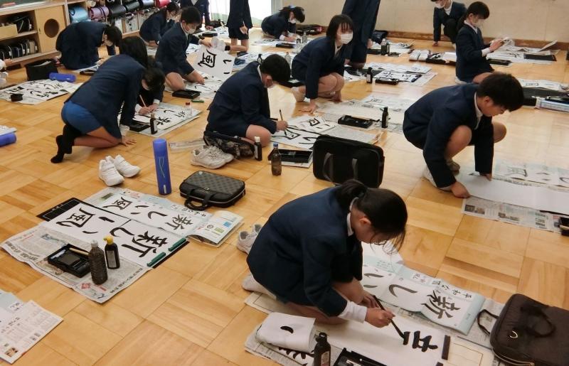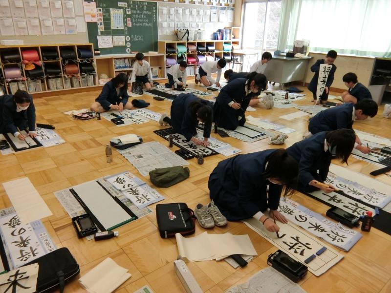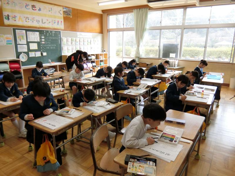 1月7日(火)、3学期がスタートしました。この日、全校で書初め大会が行われました。冬休みの間に練習してきた課題を、本番ではとても慎重に書いていました。3~6年生は毛筆で、特に3年生は床で大きな紙に書くことに慣れていないので、難しそうにしていましたが、少しずつ❝コツ❞をつかんでいたようです。どの学年も、真剣に、集中して取り組むことができました。