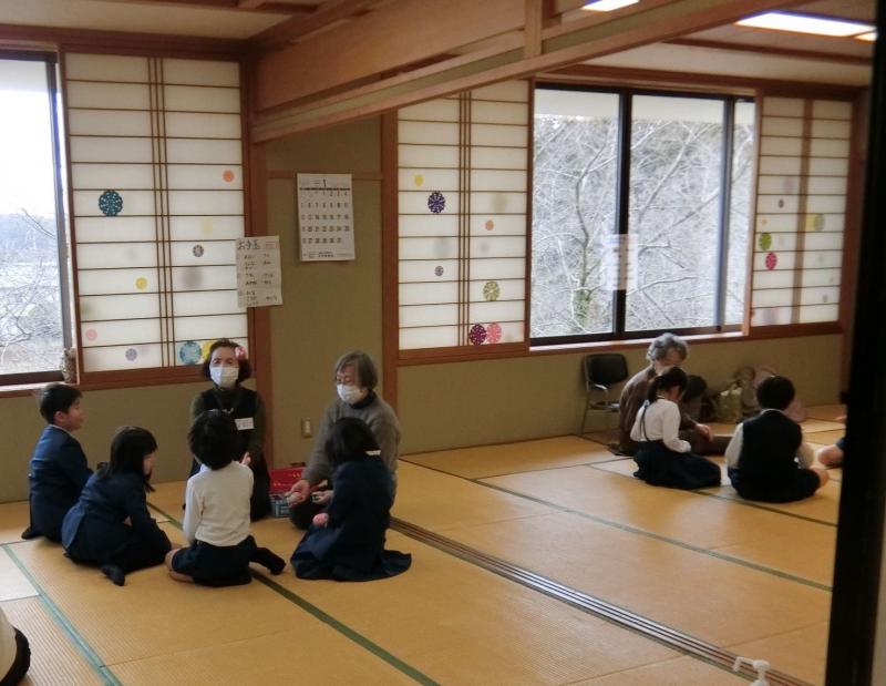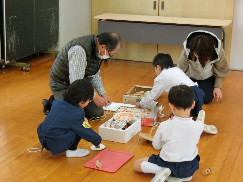 1月17日(金)、1年生が地域の方々から昔遊びを教えてもらいました。竹とんぼやコマ回し、おはじき、お手玉、あやとり、けん玉、めんこなど、昔懐かしい遊びを楽しみました。難しいものもありましたが、地域の皆さんが一緒にしてくれたので、楽しむことができました!ほのぼのと、温かくほほ笑ましいひとときでした。