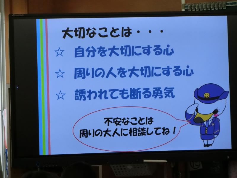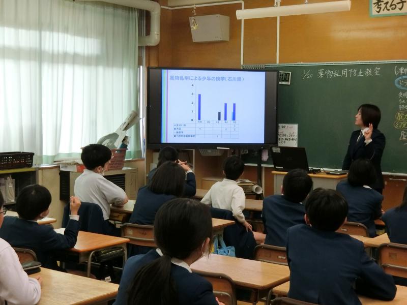 1月20日(月)、6年生を対象に薬物乱用教室が開催されました。これは毎年6年生を対象に行われており、今年も津幡警察署の方に来ていただいて、スライドを見ながらお話を聞きました。薬物についてはなんとなく知っていた6年生ですが、警察の方からのお話を聞いて、具体的にどんな怖さがあるかを学んでいました。石川県でも薬物で補導された子どもたちがたくさんいるということに、6年生のみんなは一番驚いていました。