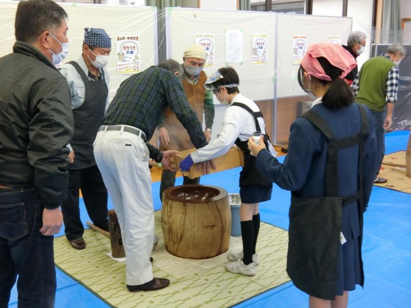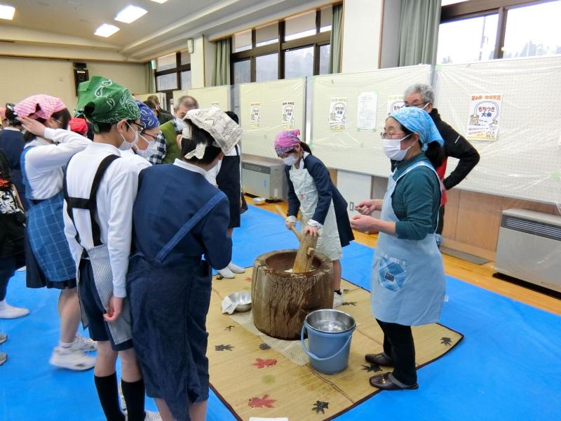 1月23日(木)、6年生と地域の方々との交流会として、餅つき大会が行われました。最初の方は地域の方々についていただき、ある程度まとまってきたら6年生が交代しながら餅つきを体験しました。そして、つきたてのお餅を丸めて、きなことあんこのお餅をつくりました。とってもおいしいお餅になりました!!自分たちでついたお餅はおいしい、本当にお米からお餅になるんだ!などといった感想が聞かれました。たくさんの地域の方々に教えていただき、あたたかいひと時となりました。