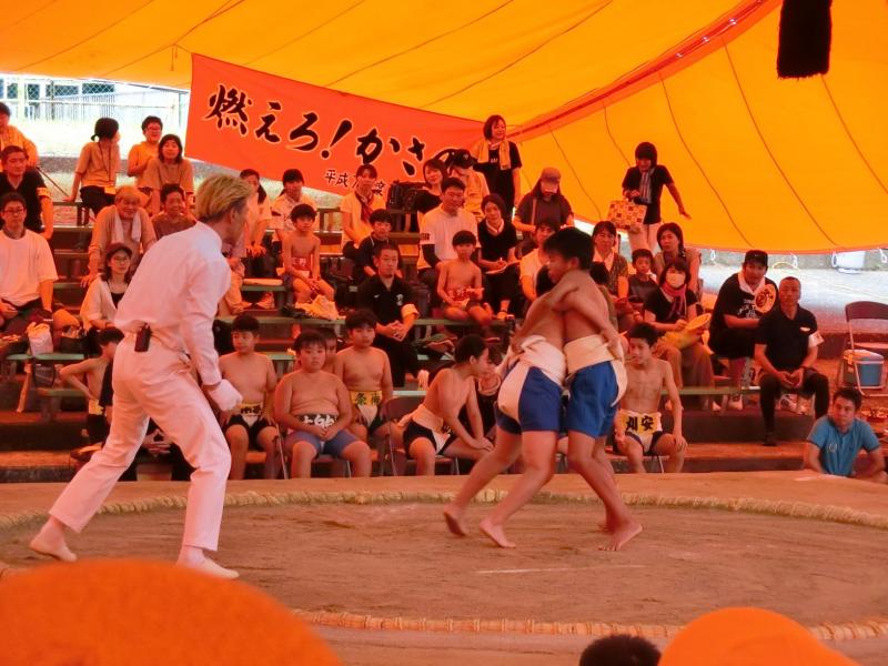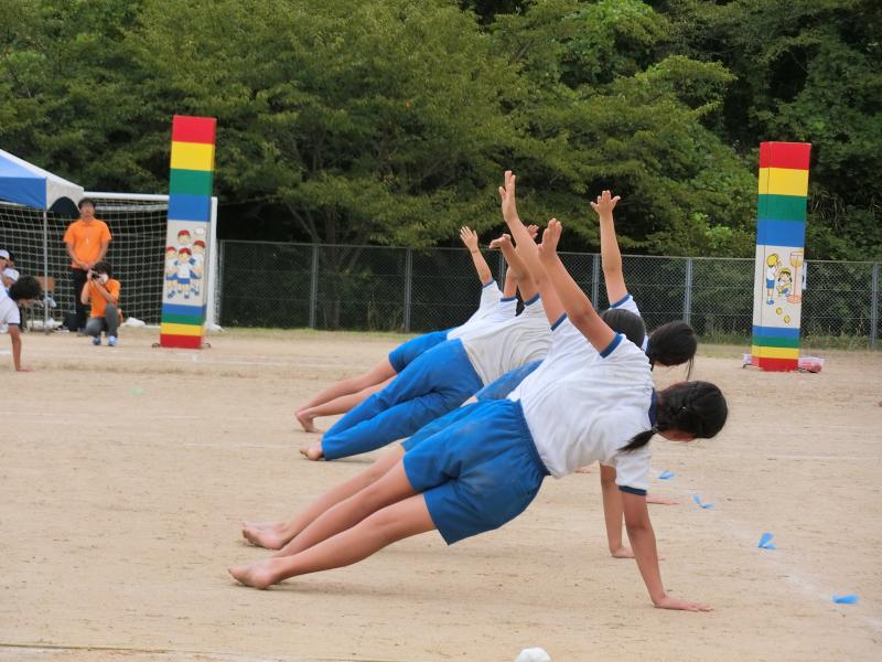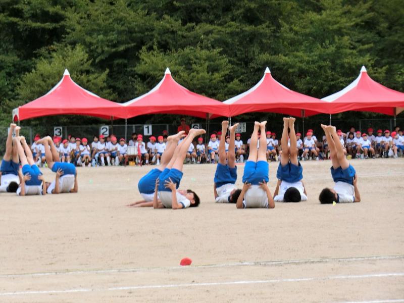 5,6年生の表現演技はプログラムの大トリを飾ります。今は,組体操の技を,一つ一つ覚えていっているところです。この日は2人ペアで行う技の練習に取り組んでいました。1本足で立たなくてはいけないので,体が揺れずにピタッときめるのはなかなか難しい技です。2人で協力しながら,かっこよくきめるために頑張っていました!