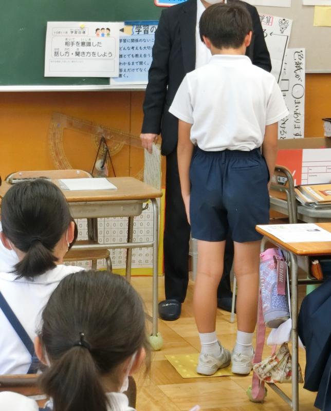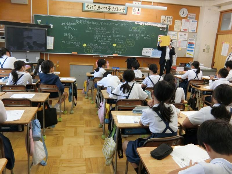 10月3日(木),4年生のみんなが,総合「助け合って生きる」の学習の一環として,視覚障害者の方と交流しました。身の回りのいろんなところに,視覚障害者の方々のための工夫があることを知りました。そして,点字を触ってみたり,代表の児童が点字ブロックを実際に踏んでみたりしました。この点字ブロックの凸凹の高さも,足で踏んでみて分かりやすいように,そして車いすの方々とっては危険にならないように,研究を重ねて決められた高さだということでした。このようなにいろいろな工夫にはとても深い意味があるのだと分かり,みんなとても納得していました。