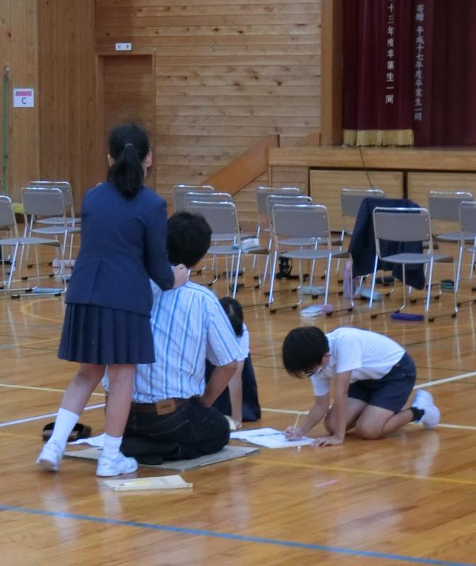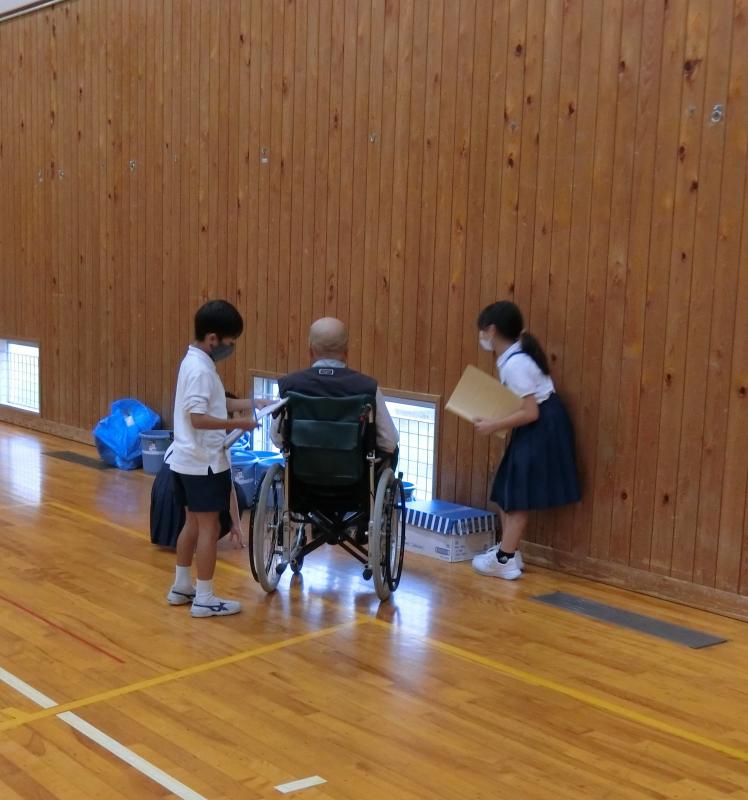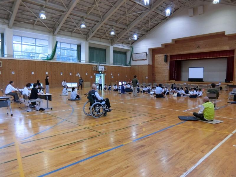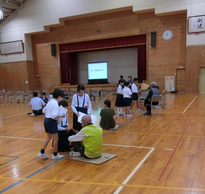 10月7日(月),4年生が災害ボランティア体験を行いました。地域の方々が「避難所を利用している人」の役になってくださり,4年生のみんなが利用者に声をかけて希望を聞いたり,元気づけたりすることを実際に体験してみました。子どもたちはグループになり,「どうやったら利用者を笑顔にできるか」を考えながら活動しました。最初は緊張からか表情が硬かったのですが,何回かやってみるうちに少しすず慣れてきたようで,笑顔で接することができるようになりました。そして,お茶を持ってきたり,肩たたきをしてあげたり,歌を歌って楽しませてあげたりと,利用者の要望にこたえていました。