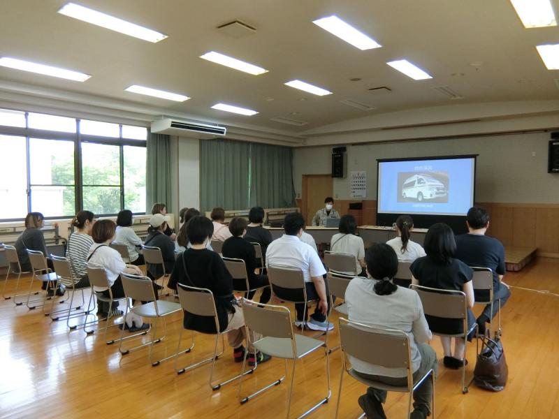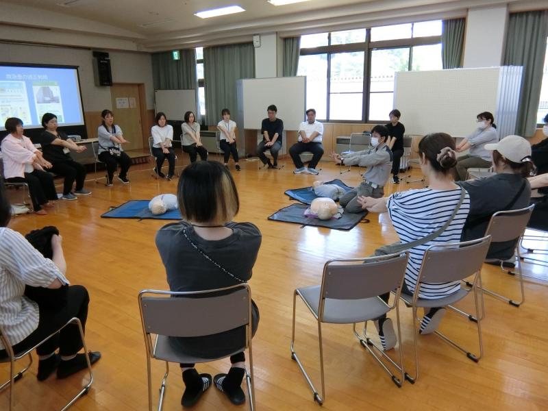 1年生の保護者の方の参加が多く,夏休みのプール開放に向けて,よい講習会になりました。赤十字の指導員の方から,心肺蘇生の手順やAEDの使い方を分かりやすく教えていただきました。
