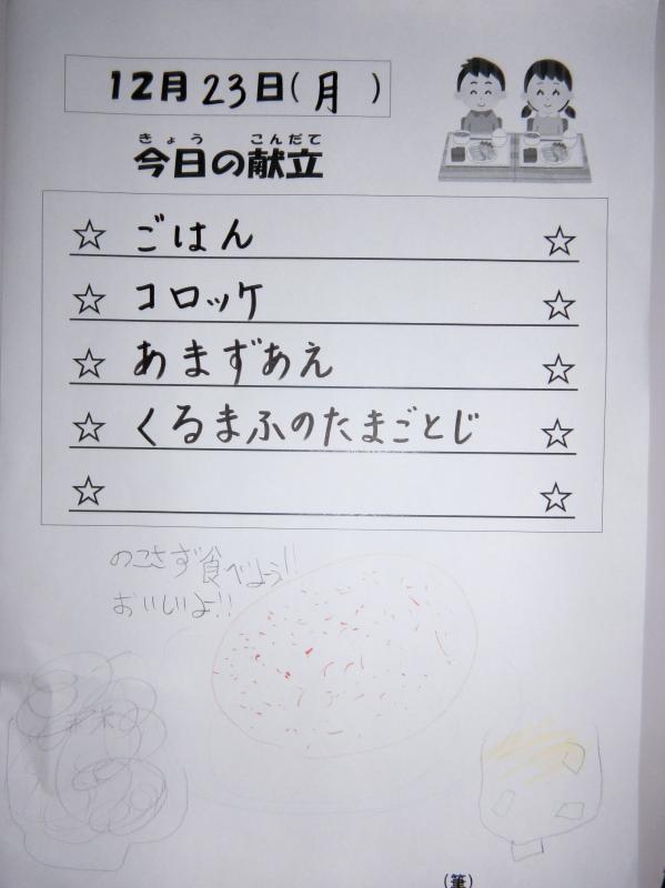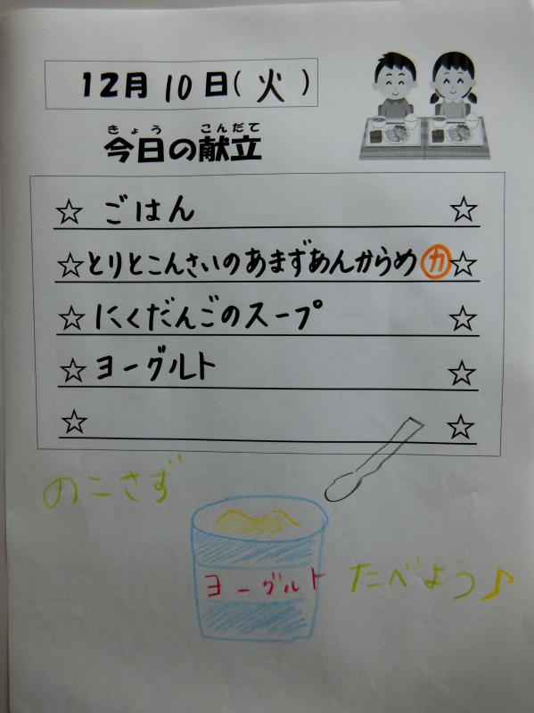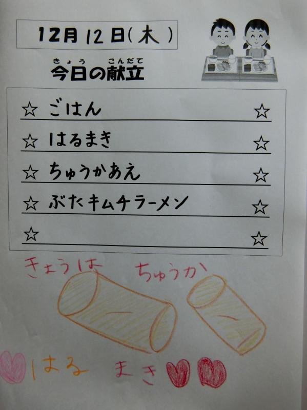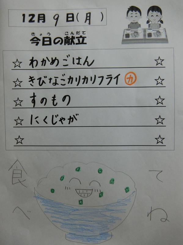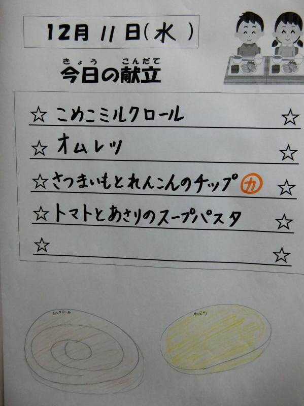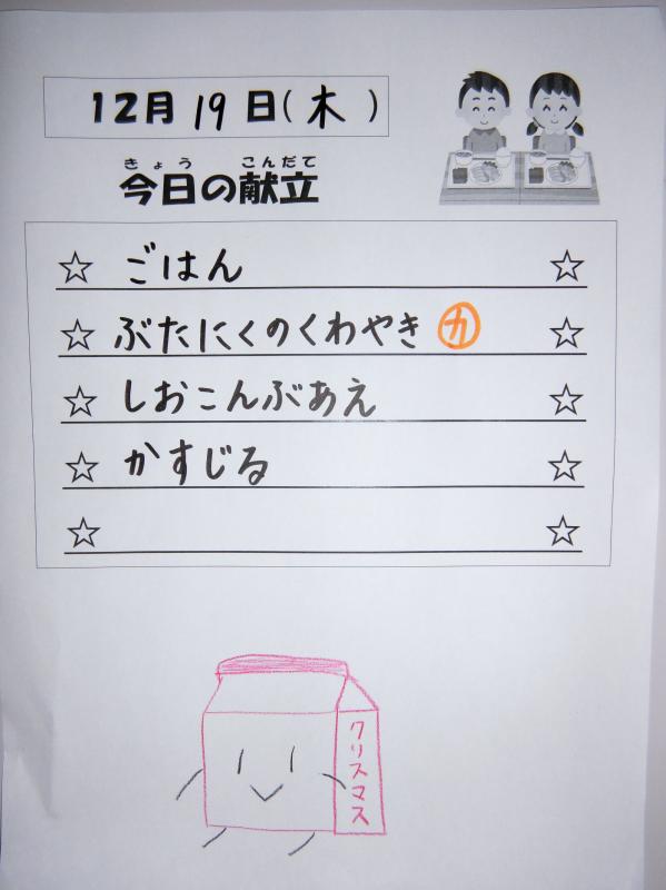 早いもので、今週で2学期も終わりとなります。今週は、ラストの25日がクリスマス献立となっていて、もみのきハンバーグやクリスマスデザートが出る予定です!!とても楽しみですね。