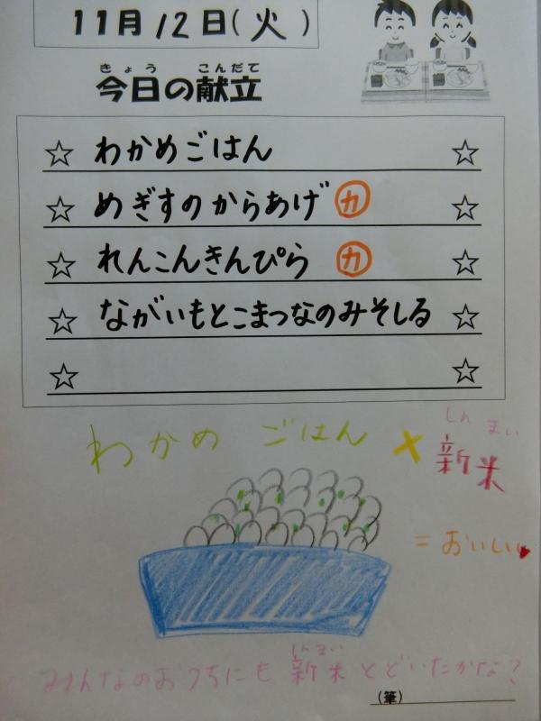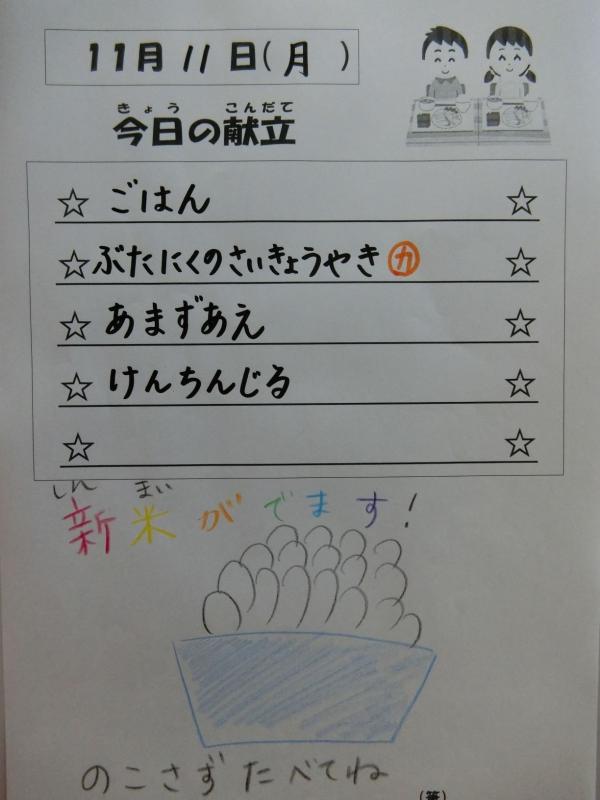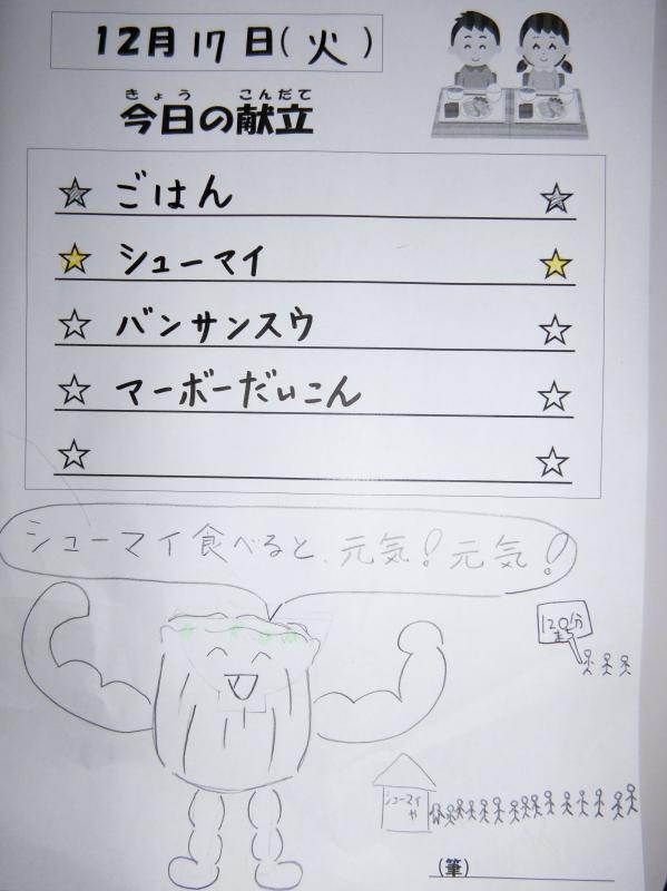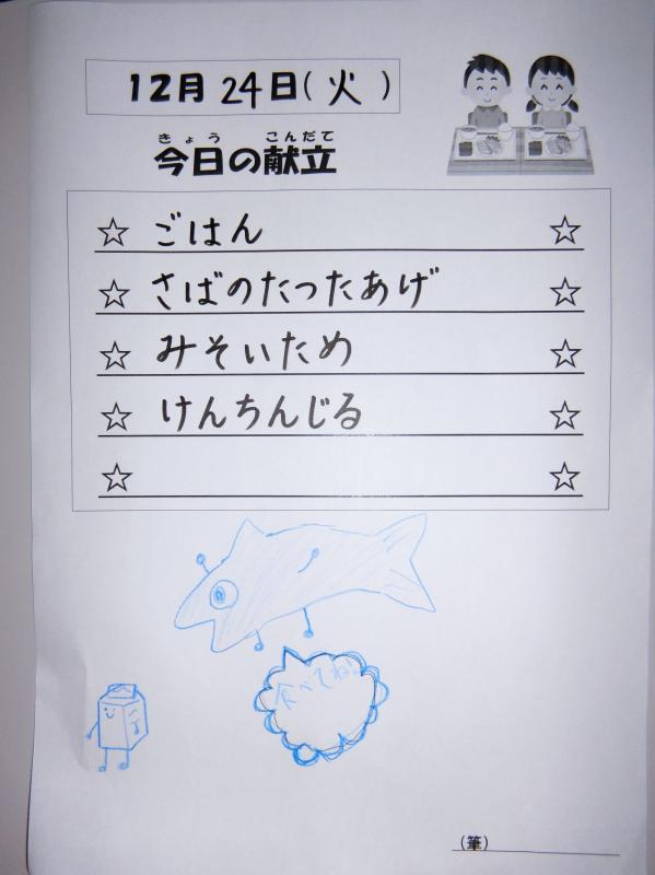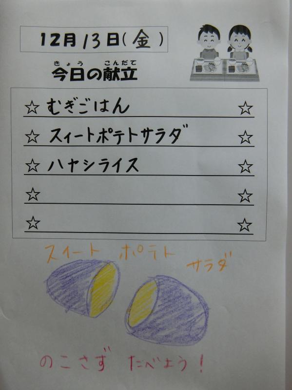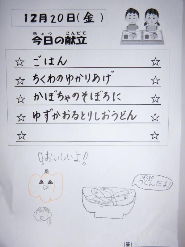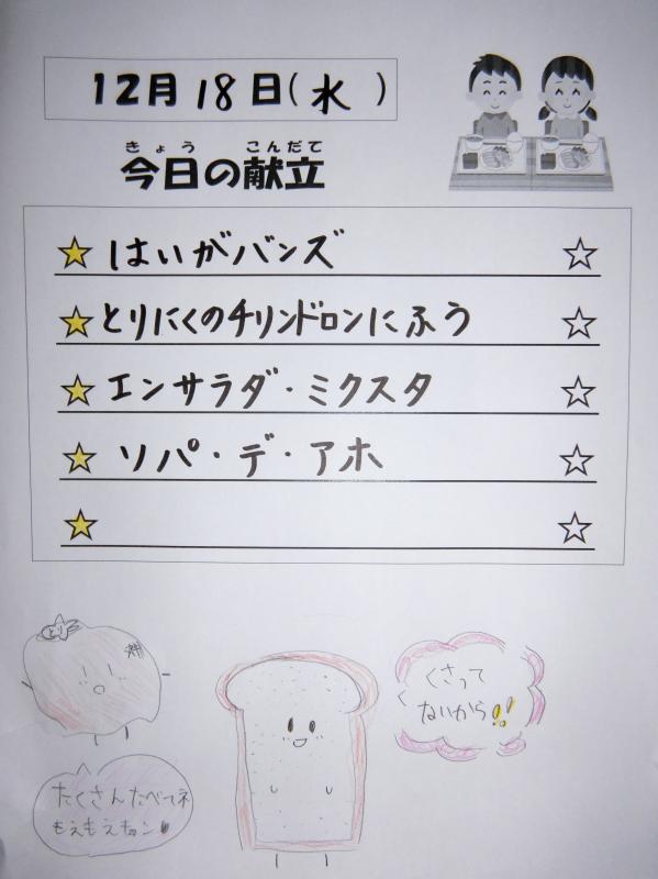 早いもので、今週で2学期も終わりとなります。今週は、ラストの25日がクリスマス献立となっていて、もみのきハンバーグやクリスマスデザートが出る予定です!!とても楽しみですね。