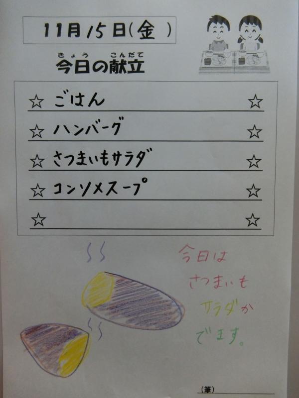 今週は火曜日の献立に中華飯があります。子どもたちには、丼物・ご飯にかけて食べるメニューは人気があります!金曜日にはかほっくりサラダが出ます。かほくの特産品を使ったメニューです。楽しみですね。