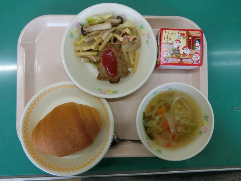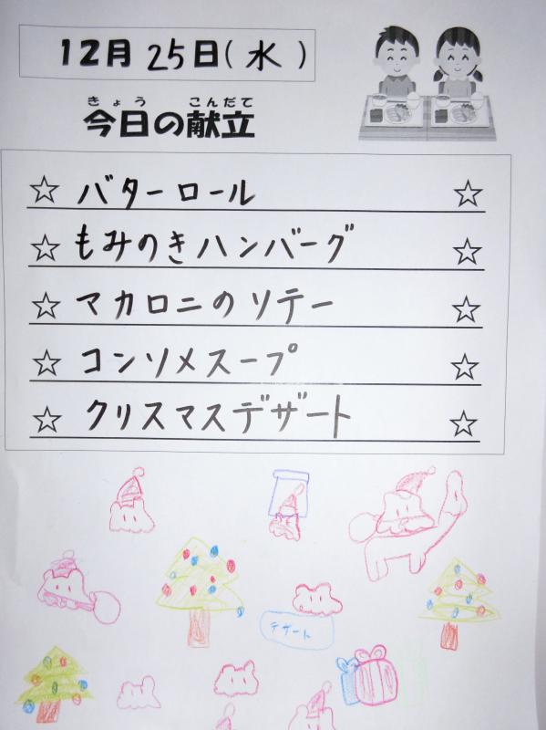 12月25日(水)、2学期最後の献立は、クリスマスメニューでした!かわいいもみの木ハンバーグ、そして、デザートにはチョコレートケーキ!!クリスマスムード漂うメニューに、みんな大喜びでした!